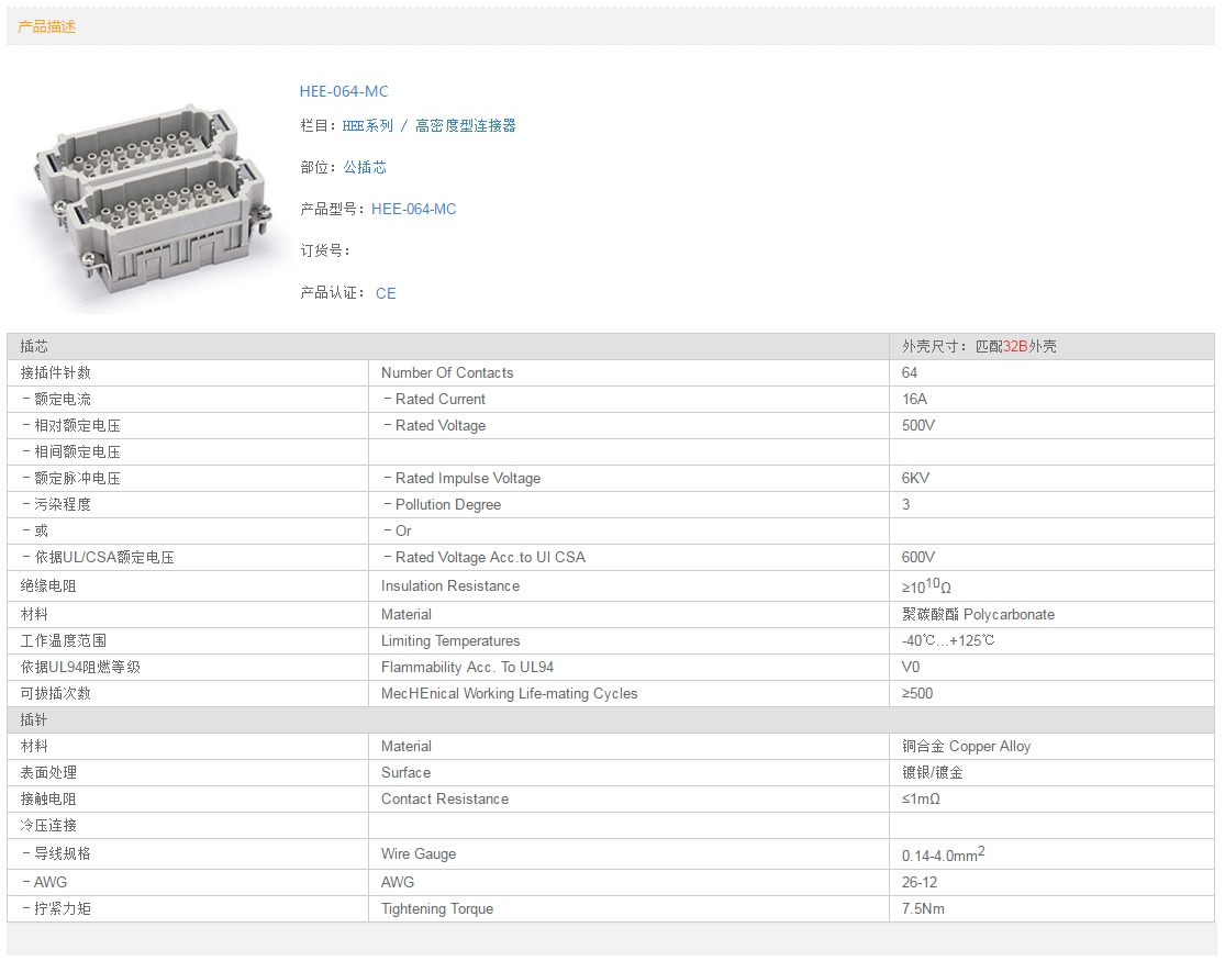 高密度型插芯 冷壓連接 HEE-064-MC ..