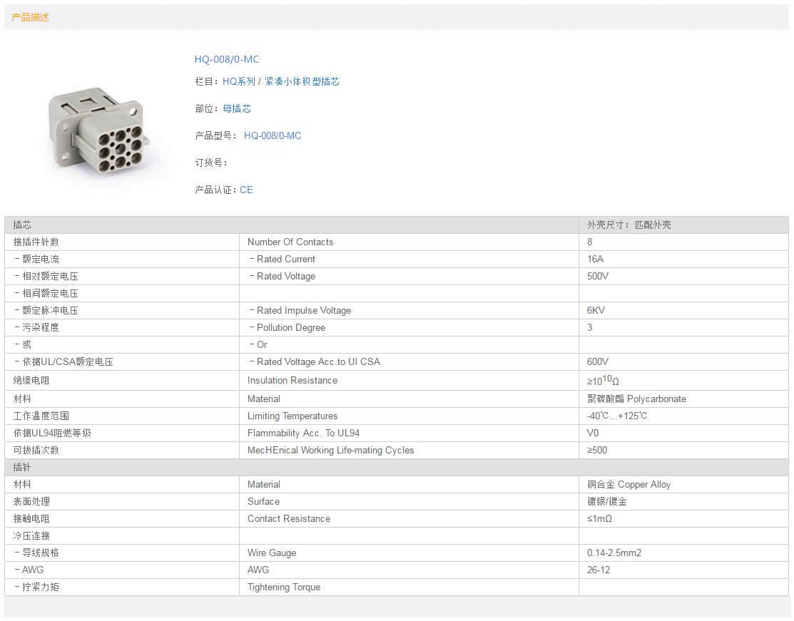 緊湊小體積型插芯 冷壓連接 HQ-008 0-MC ..