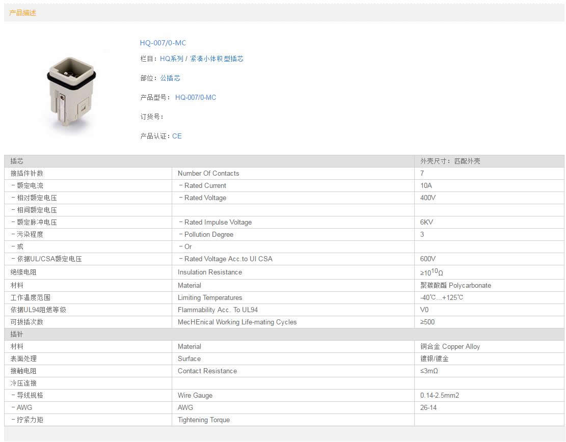 緊湊小體積型插芯 冷壓連接 HQ-007 0-MC ..